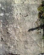 - Foto inferior derecha: fragmento de campo epigráfico de una de la dos piedras honorarias empotradas en la parte inferior del muro sur de la ermita.